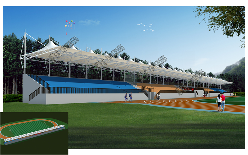 该工程属于典型的骨架式膜结构,平面呈矩形布置,长度分别为179米和13米。空间布置平面弧型